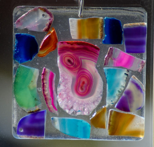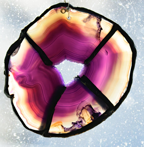 A circular resin suncatcher with agate